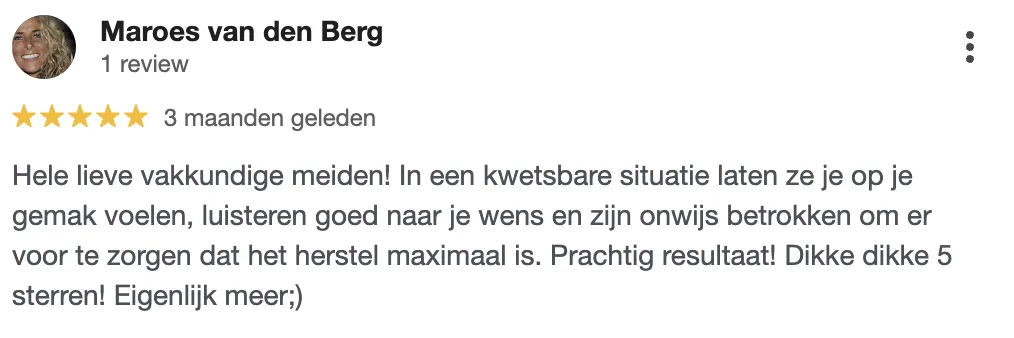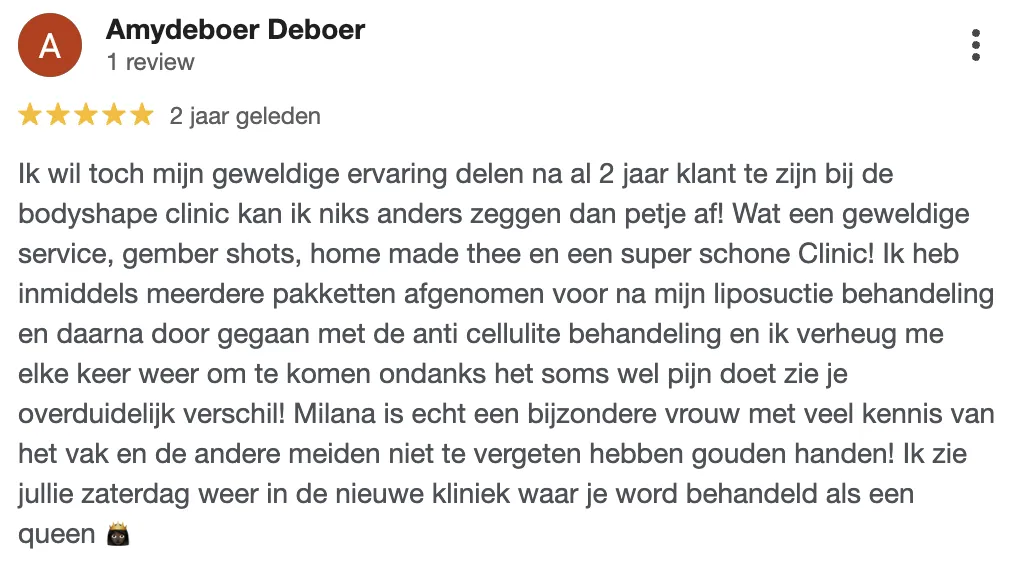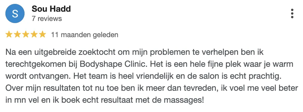 "Na een uitgebreide zoektocht om mijn problemen te verhelpen ben ik terechtgekomen bij Bodyshape Clinic. Het is een hele fijne plek waar je warm wordt ontvangen. Het team is heel vriendelijk en de salon is echt prachtig. Over mijn resultaten tot nu toe ben ik meer dan tevreden, ik voel me veel beter in mn vel en ik boek echt resultaat met de massages!"